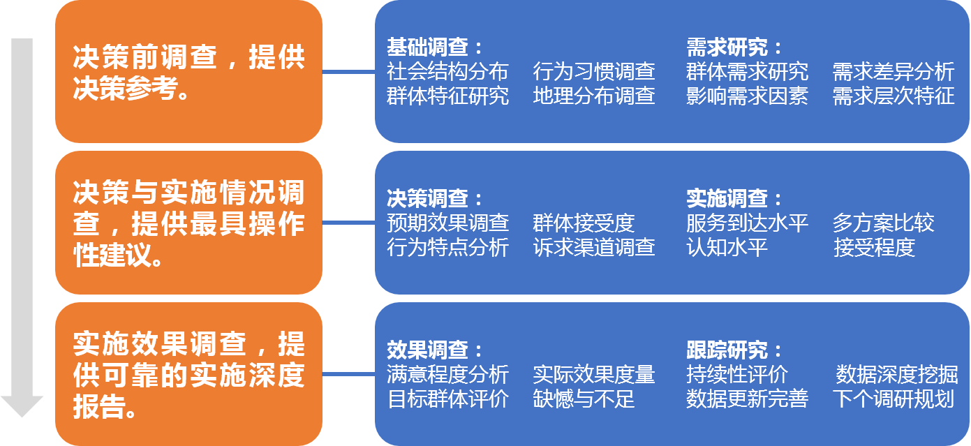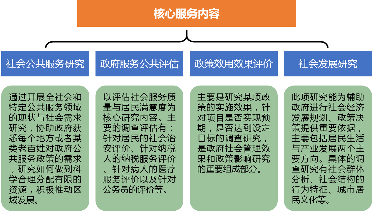 目前我國各級政府在追求發(fā)展效率的同時,也在積極推動和創(chuàng)建和諧社會,如何掌握社會需求,提供合理服務(wù),降低社會公共事務(wù)成本,取得工作好評對于決策和執(zhí)行層都非常重要。另外如何科學(xué)、合理、客觀地由社會對工作做出真實評估,對于總結(jié)特點(diǎn)、發(fā)揚(yáng)優(yōu)勢、彌補(bǔ)不足更為重要。華夏經(jīng)緯在政府/協(xié)會等領(lǐng)域擁有豐富的資料、最新的政府統(tǒng)計信息及相關(guān)研究經(jīng)驗,并受到了各級政府和職能部門的充分肯定。